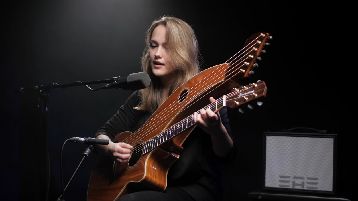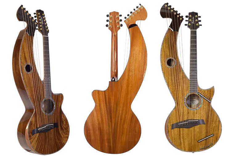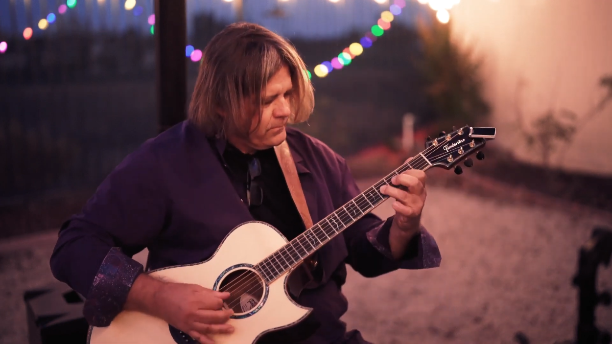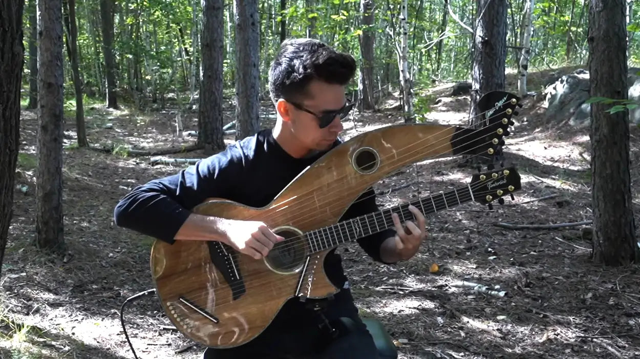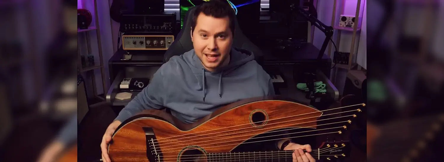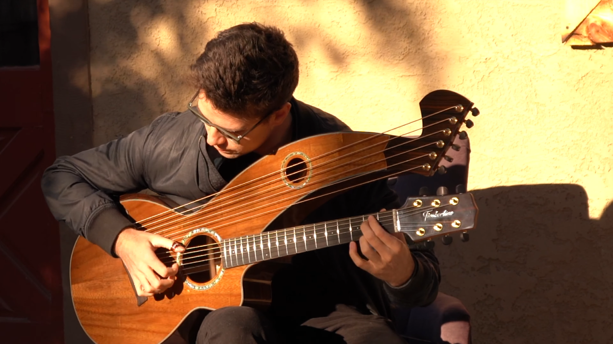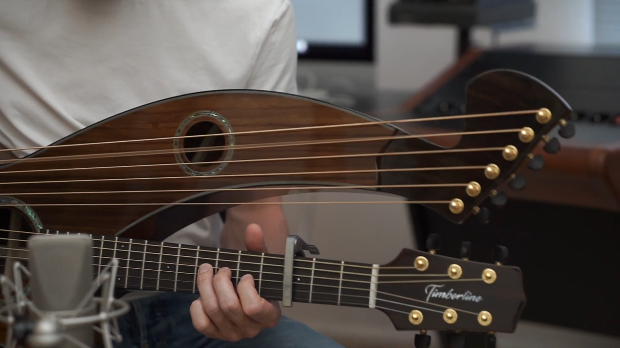 playing his cover of The Beatles’ “Michelle” on a Timberline® T80/20HGc-e 20 String Auditorium harp guitar