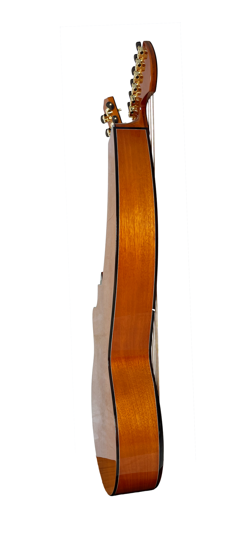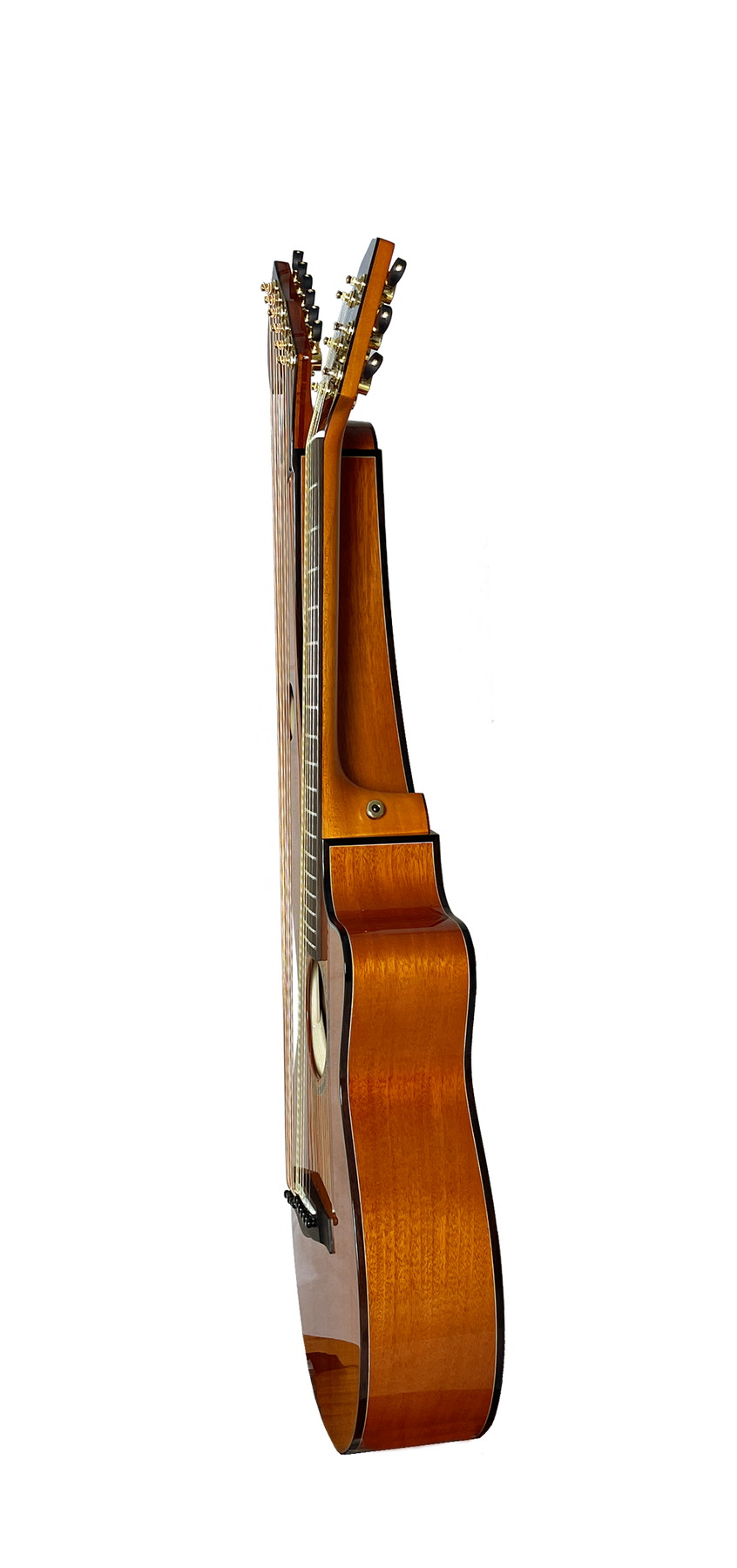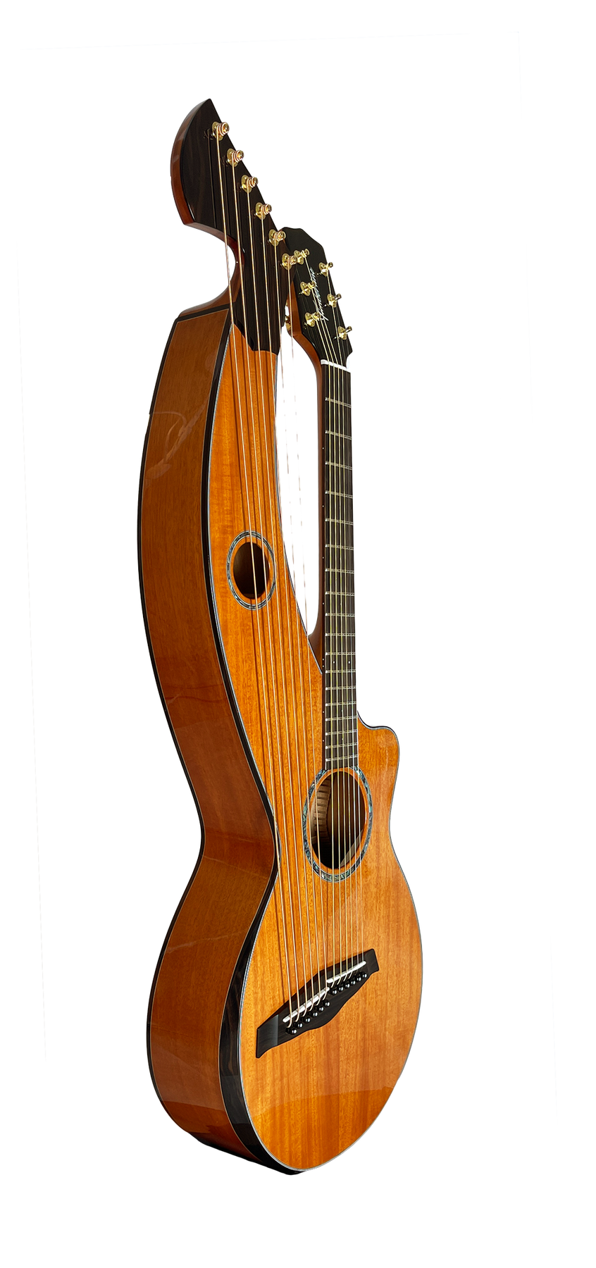 T30HGpc Premium 100% Tropical Mahogany 12 String Parlor sized harp guitar with ebony fretboard, arm bevel and bridge.